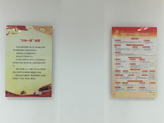 黨員活動(dòng)室在醒目位置特設(shè)主題教育墻,包括黨旗、入黨誓詞、黨員義務(wù)和權(quán)利;顒(dòng)室內(nèi)有8個(gè)宣傳展版,內(nèi)容包括組織架構(gòu)圖、黨委委員崗位職責(zé)、紀(jì)委委員崗位職責(zé)、民主生活會(huì)組織生活會(huì)制度、“三會(huì)一課”制度、民主評(píng)議黨員制度、發(fā)展黨員工作流程圖和黨員活動(dòng)日制度。活動(dòng)室還配備了報(bào)刊書架,擺放黨員學(xué)習(xí)書刊雜志等。